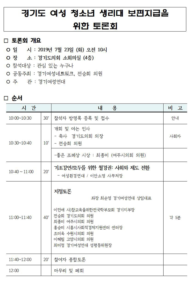제목: 경기도 여성 청소년 생리대 보편지급을 위한 토론회