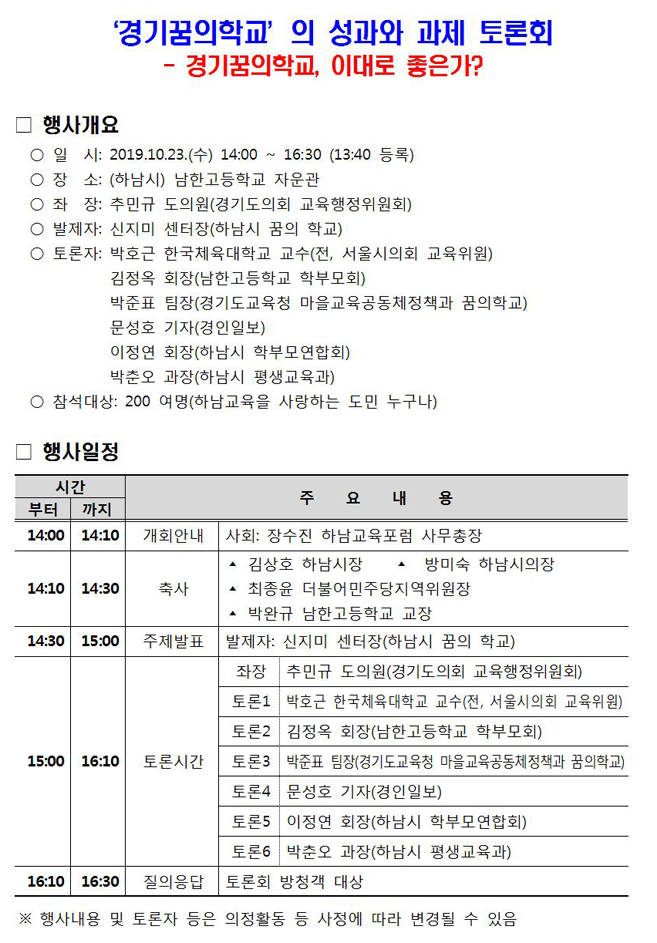 제목: ‘경기꿈의학교의 성과와 과제 토론회 - 경기꿈의학교, 이대로 좋은가?’