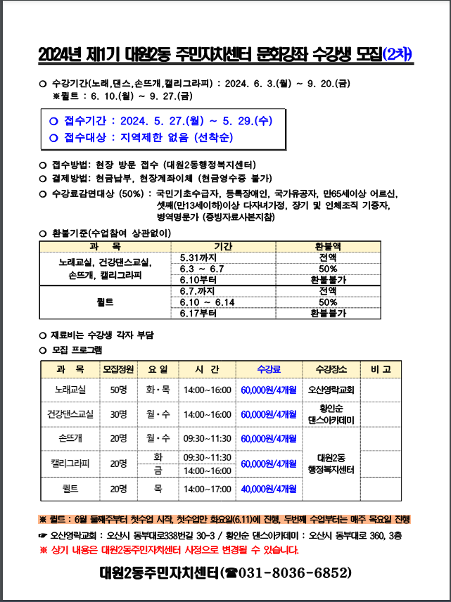 대원2동 주민자치센터 문화강좌 수강생 모집