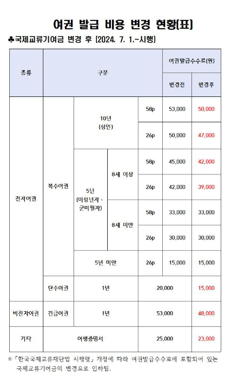 여권 발급 비용 변경 현황(표) 안내(비용인하 알림)