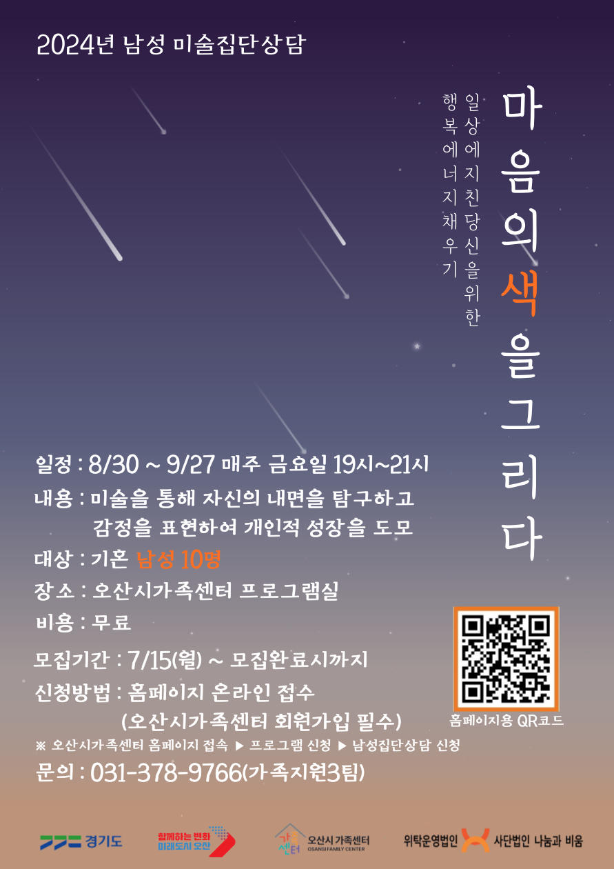 오산시가족센터 남성 미술 집단상담 '마음의 색을 그리다' 참가자 모집 안내