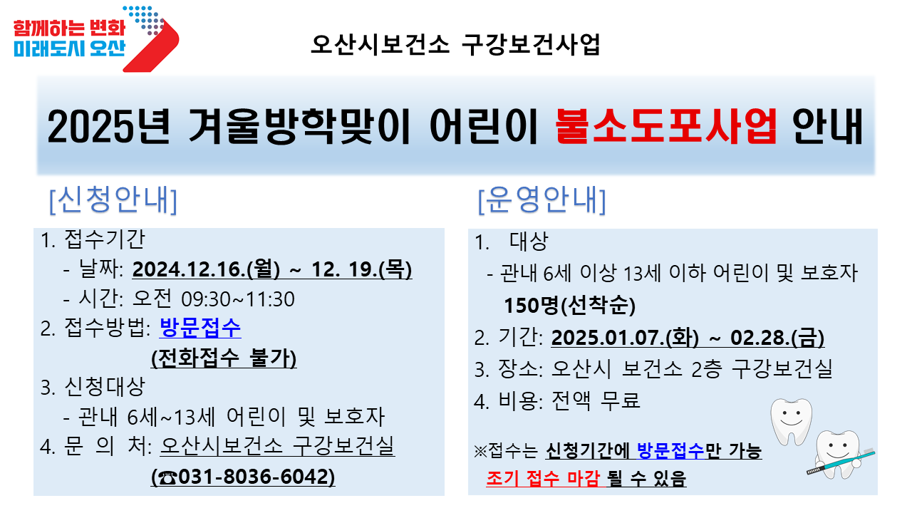 [오산시보건소] 2025년 겨울방학 맞이 어린이 불소도포 사업 안내