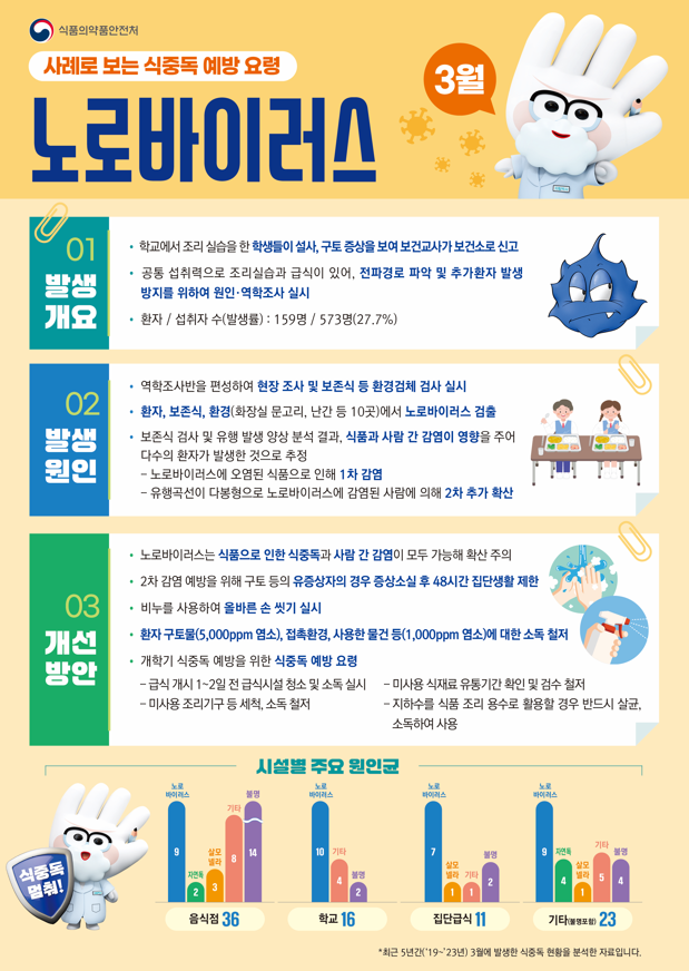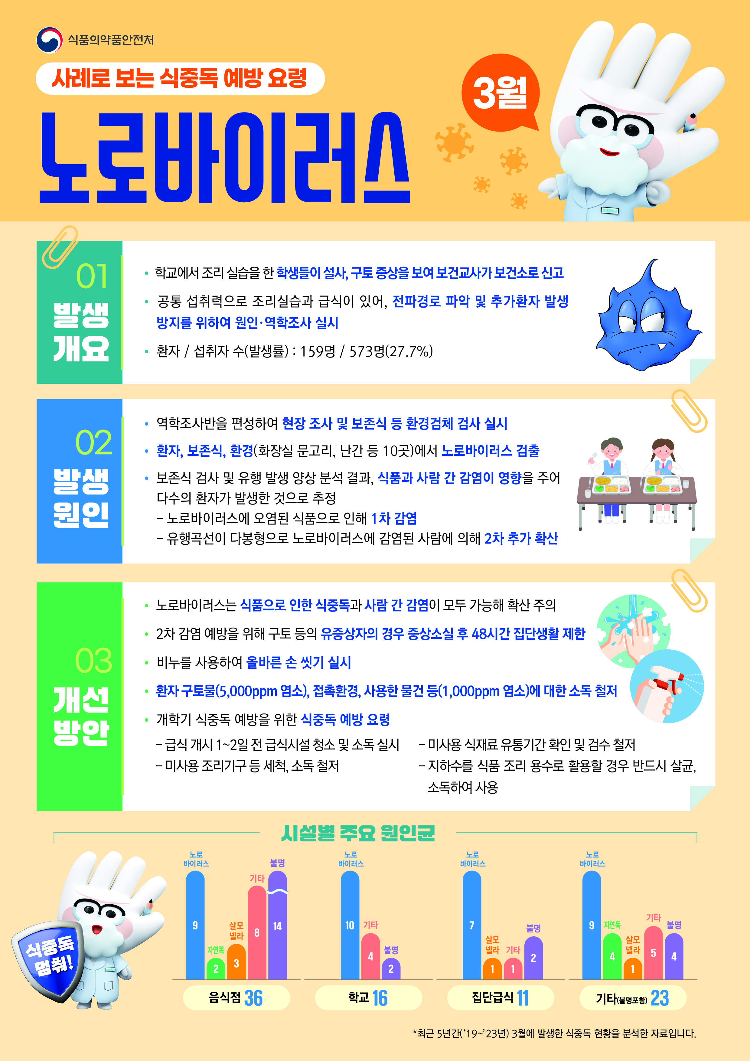 노로바이러스는 식품으로 인한 식중독과 사람 간 감염이 모두 가능하므로 확산에 주의하시기 바랍니다.