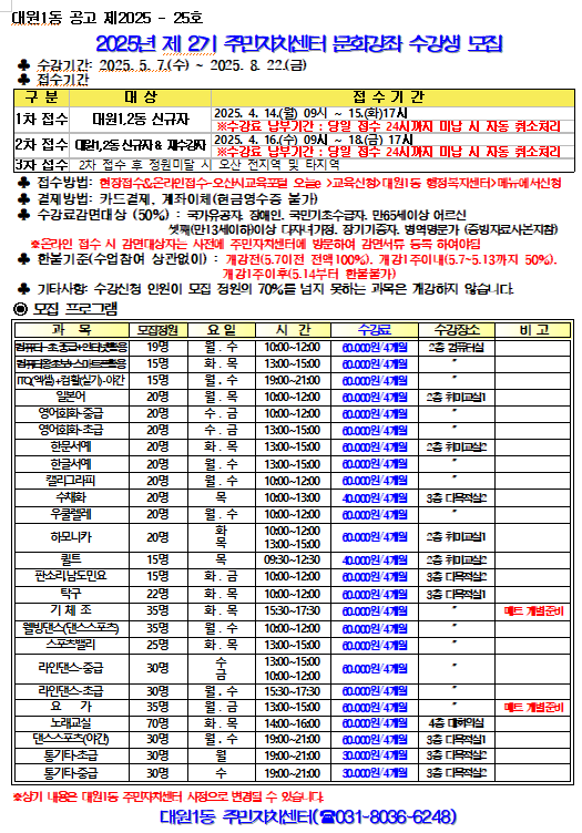 2025년 제2기 대원1동 주민자치센터 문화강좌 수강생 모집 공고