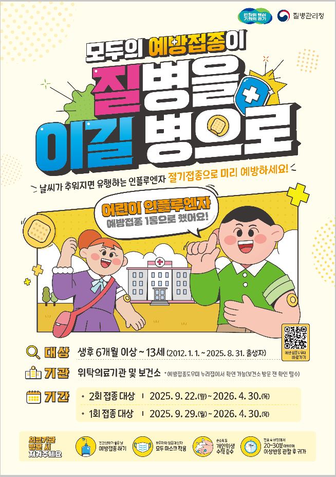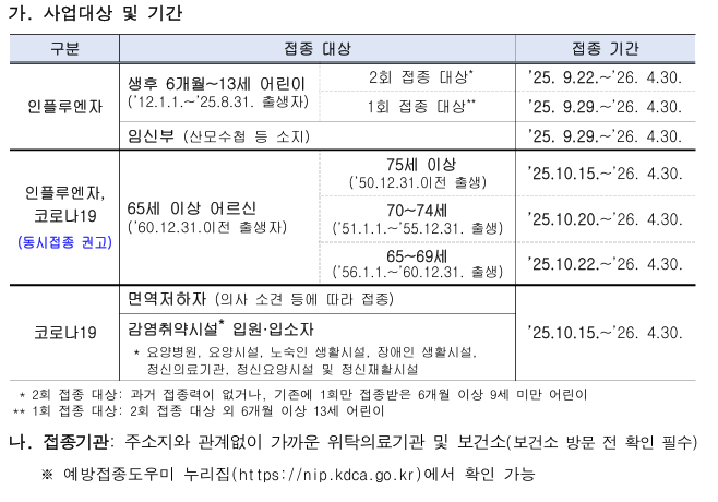 이에 다가오는 겨울철 감염병 유행에 대비하여 2025-2026절기 인플루엔자·코로나19국가예방접종사업을 아래와 같이 실시할 예정입니다.