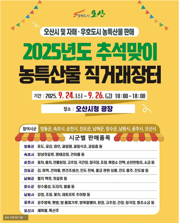 [오산시] 2025 추석맞이 농특산물 직거래장터 안내(9.24~ 9.26)