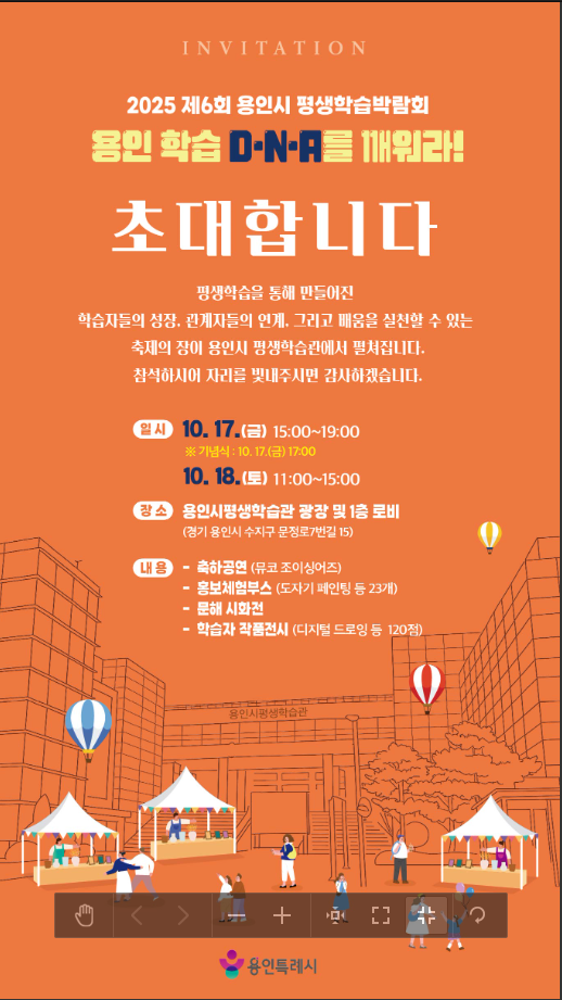 「2025년 제6회 용인시평생학습 박람회」를 개최하오니 많은 관심과 참여 바랍니다.