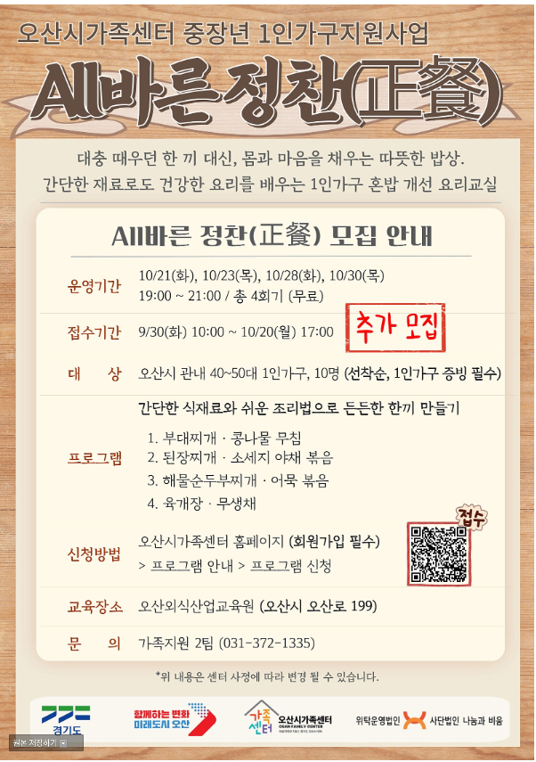 [오산시가족센터] 중장년 1인가구지원 요리교실 참여자 모집
