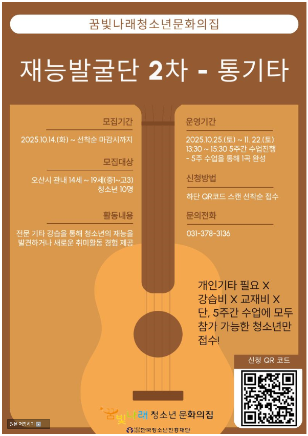 [오산 꿈빛나래청소년문화의집] 재능발굴단 2차(통기타) 모집합니다