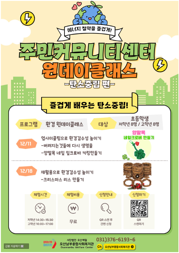 [오산남부종합사회복지관] 탄소중립 무료 원데이 클래스 참여자 모집
