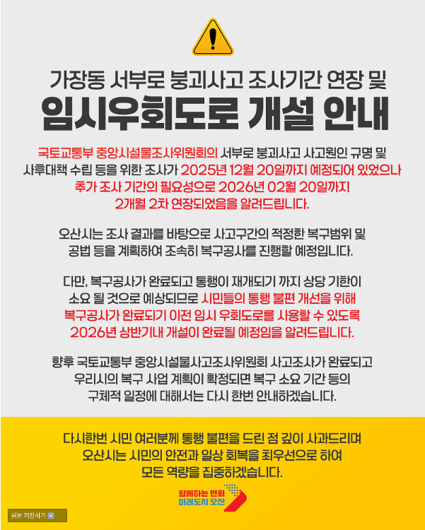 가장동 서부로 붕괴사고 조사기간 추가연장 및 임시 우회도로 개설 안내