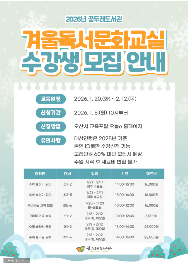 [꿈두레도서관] 2026년 꿈두레도서관 겨울독서문화교실 수강생 모집 안내