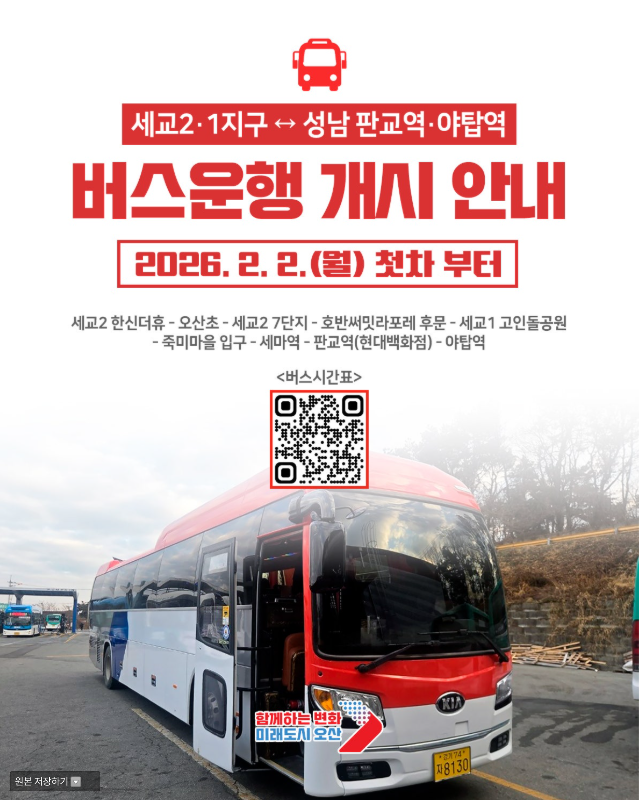 오산 세교2 · 1 ↔ 성남 판교·야탑 버스운행 개시 알림(8303번)