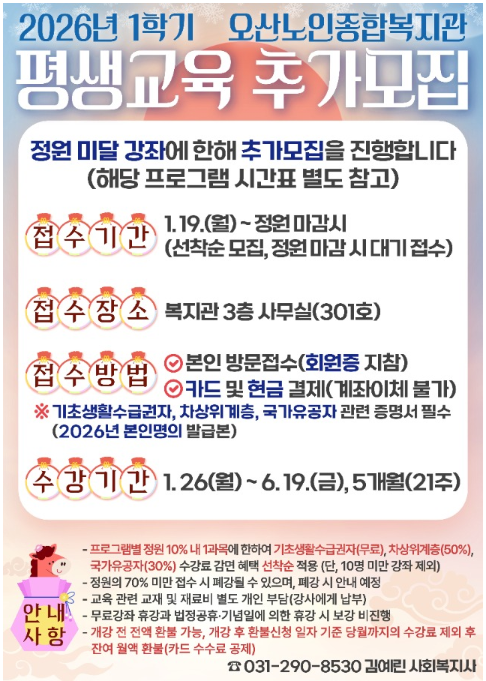 [오산노인종합복지관] 2026년 1학기 오산노인종합복지관 평생교육 프로그램(1~6월) 추가모집