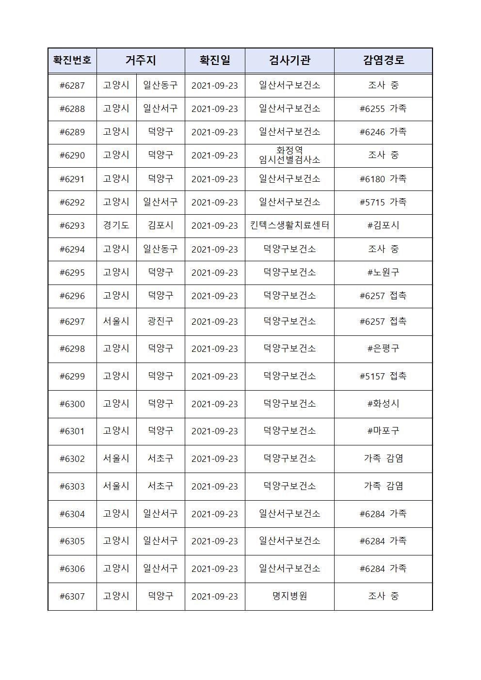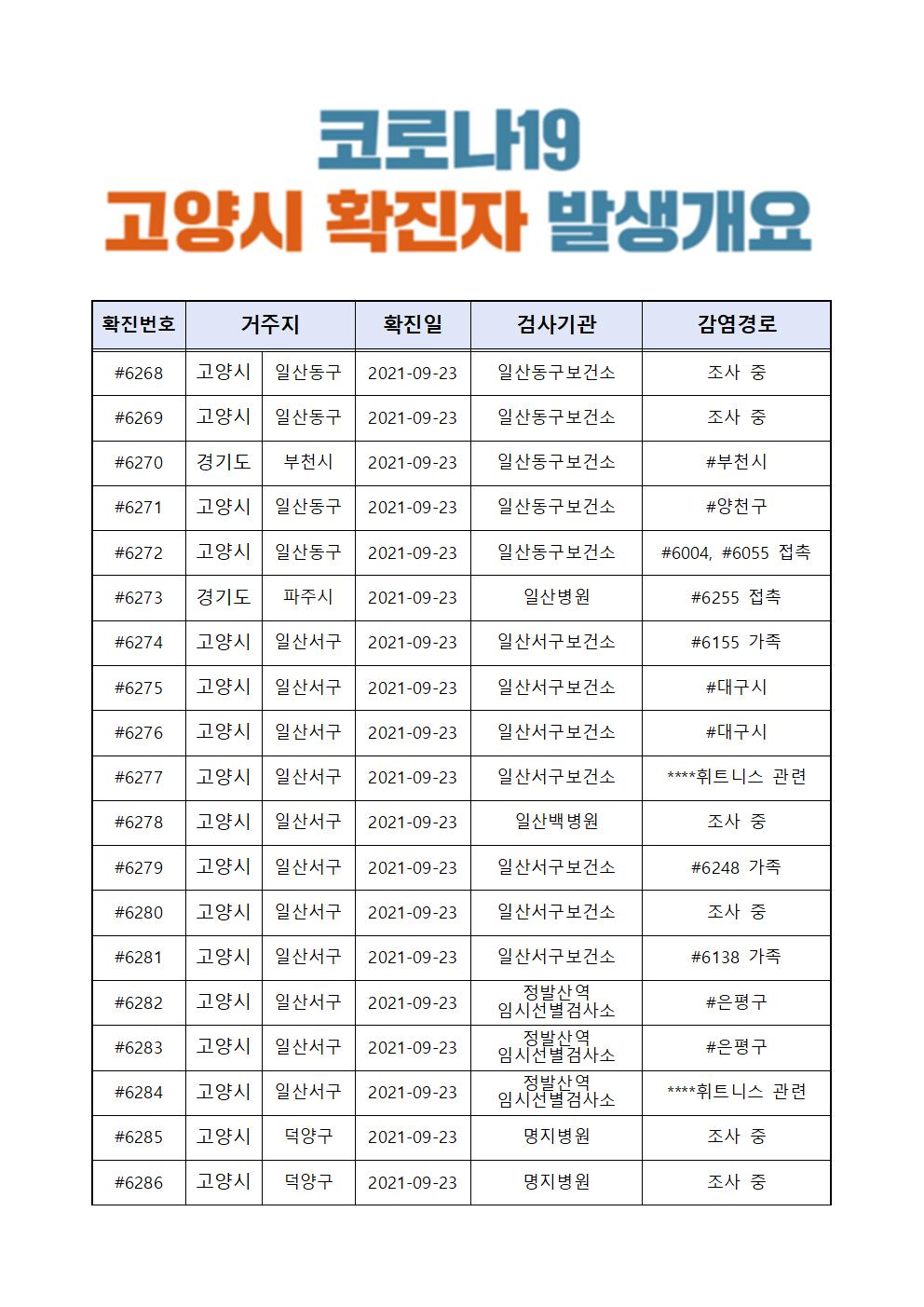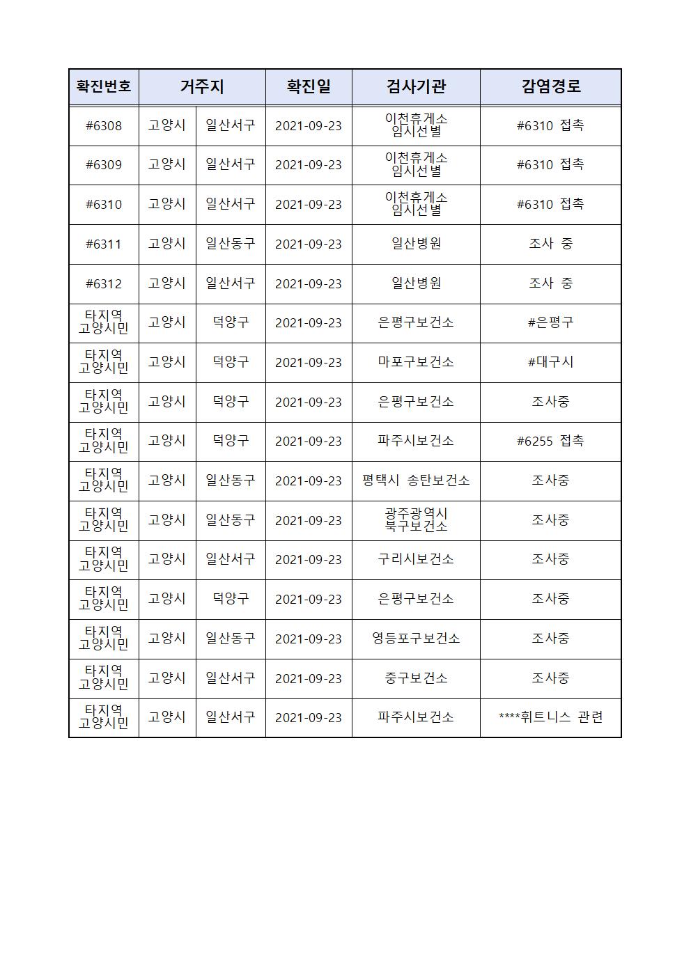 코로나19 고양시-6268~6312, 타지역 확진자 발생개요(09.23.목)
