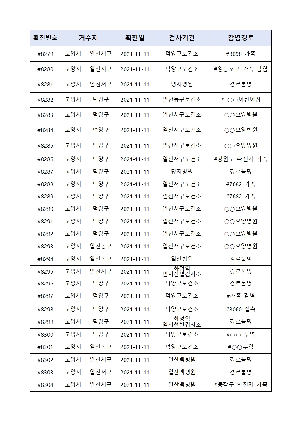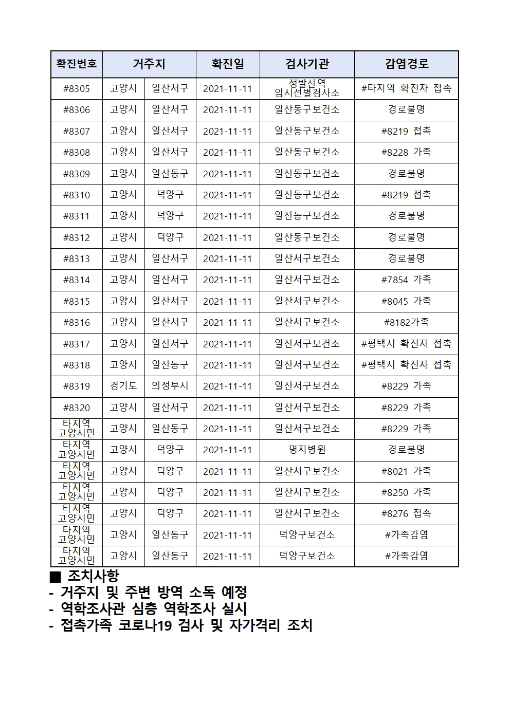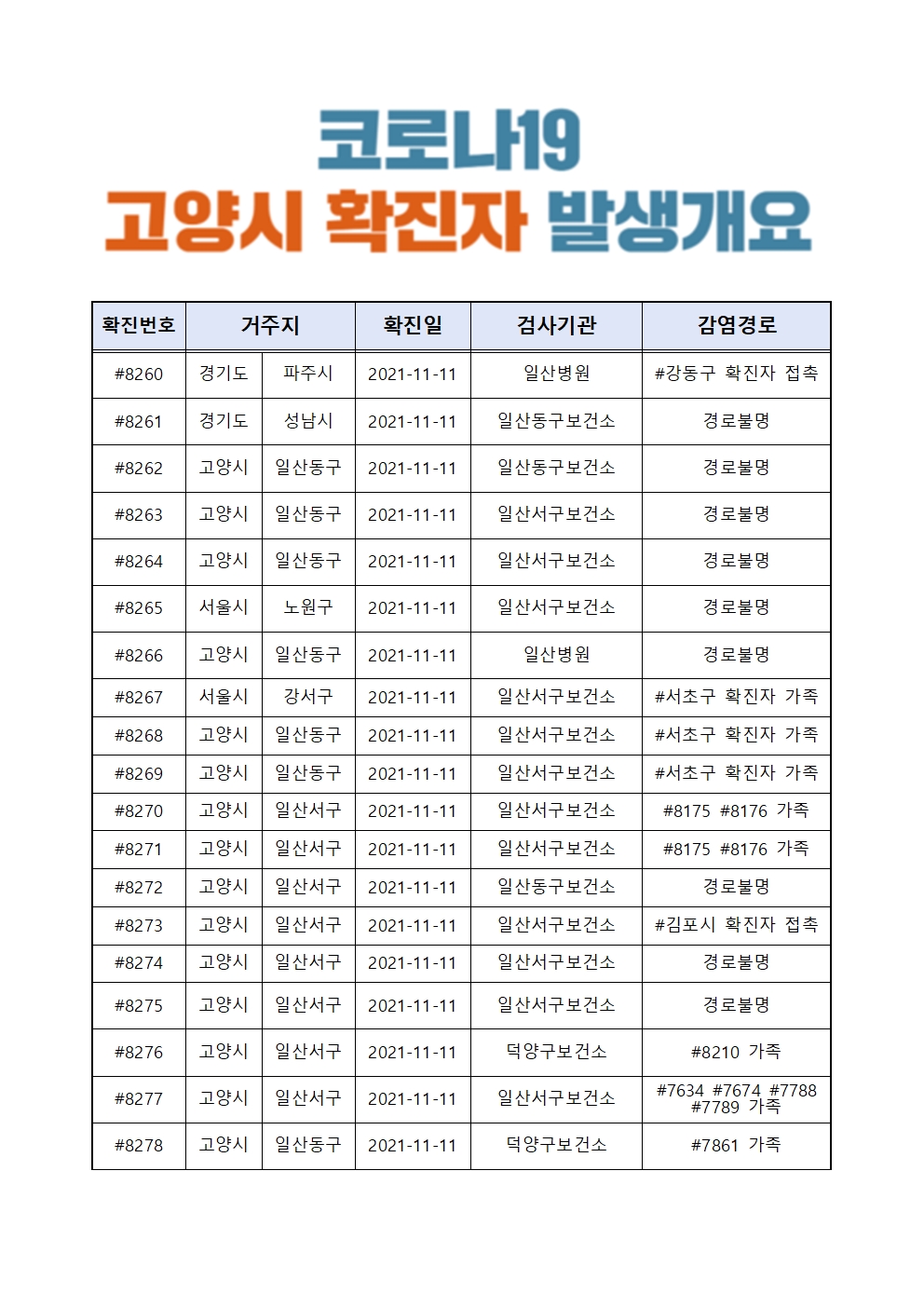 코로나19 고양시-8260~8320, 타지역 확진자 발생개요(11.11.목)