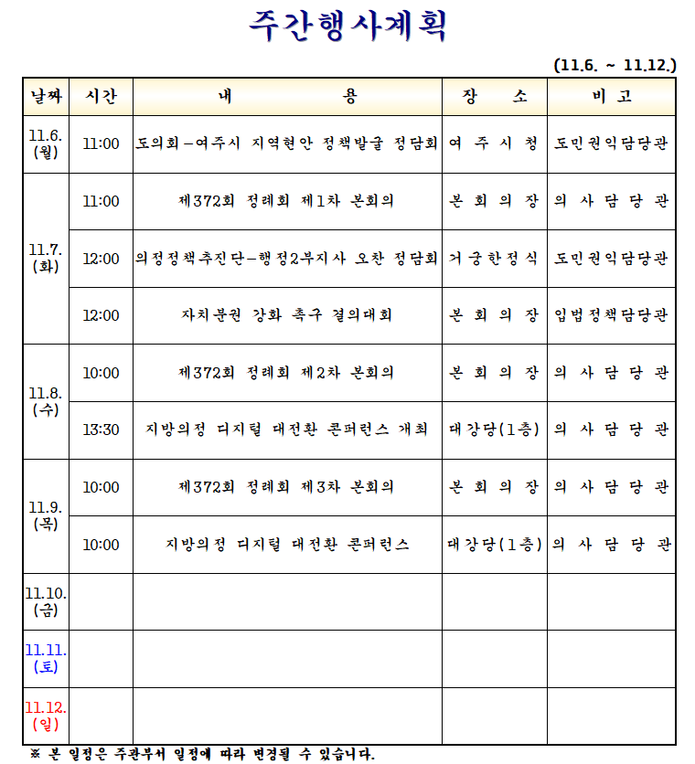 경기도의회 주간행사계획 안내(11.6.~11.12)