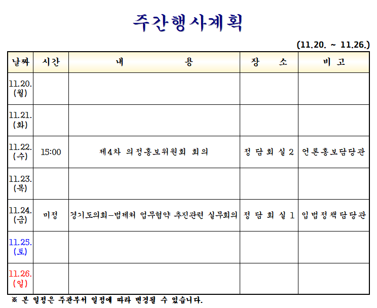 경기도의회 주간행사계획 안내(11.20.~11.26.)