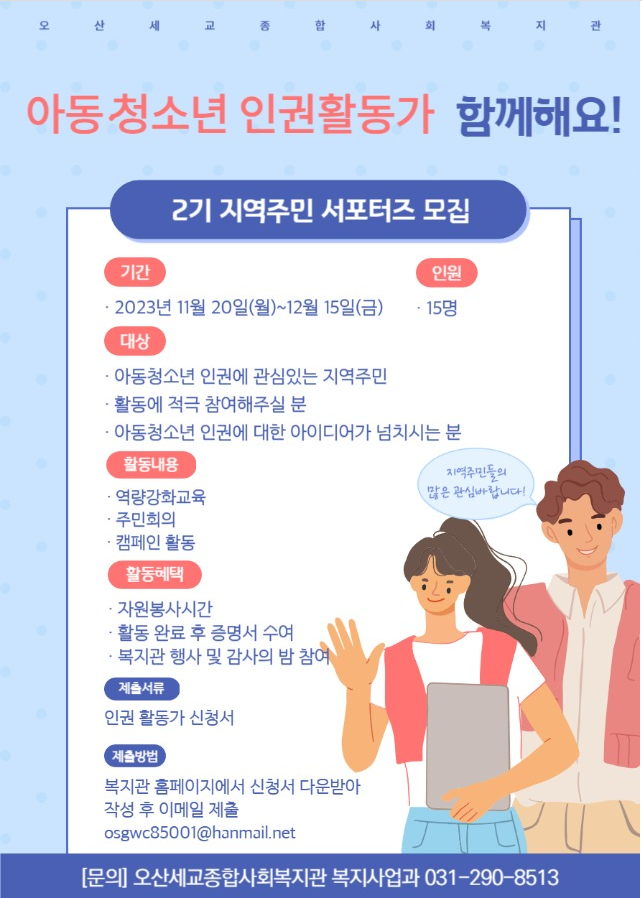 [오산세교종합사회복지관]2024년 아동청소년 인권활동가(지역주민 서포터즈) 2기 모집