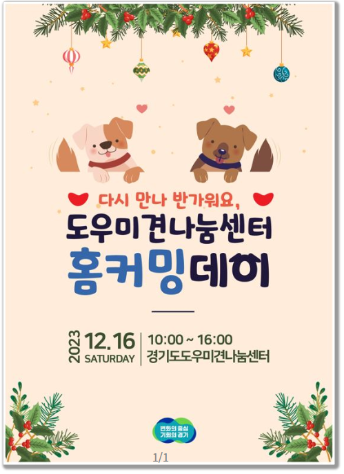 ○ 경기도, 12월 16일 도우미견나눔센터에서 ‘다시 만나 반가워요’ 주제로 행사