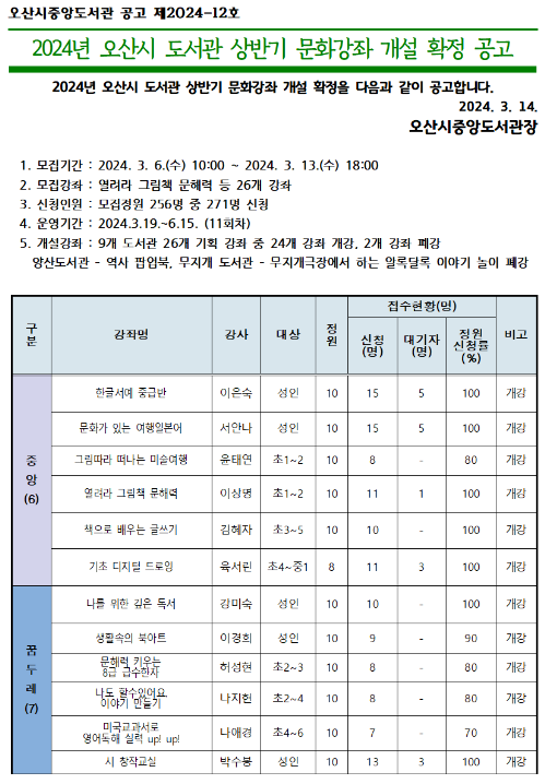 2024년 오산시 도서관 상반기 문화강좌 모집