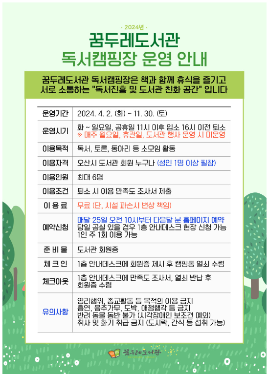 꿈두레도서관 독서캠핑장 운영 및 예약 안내